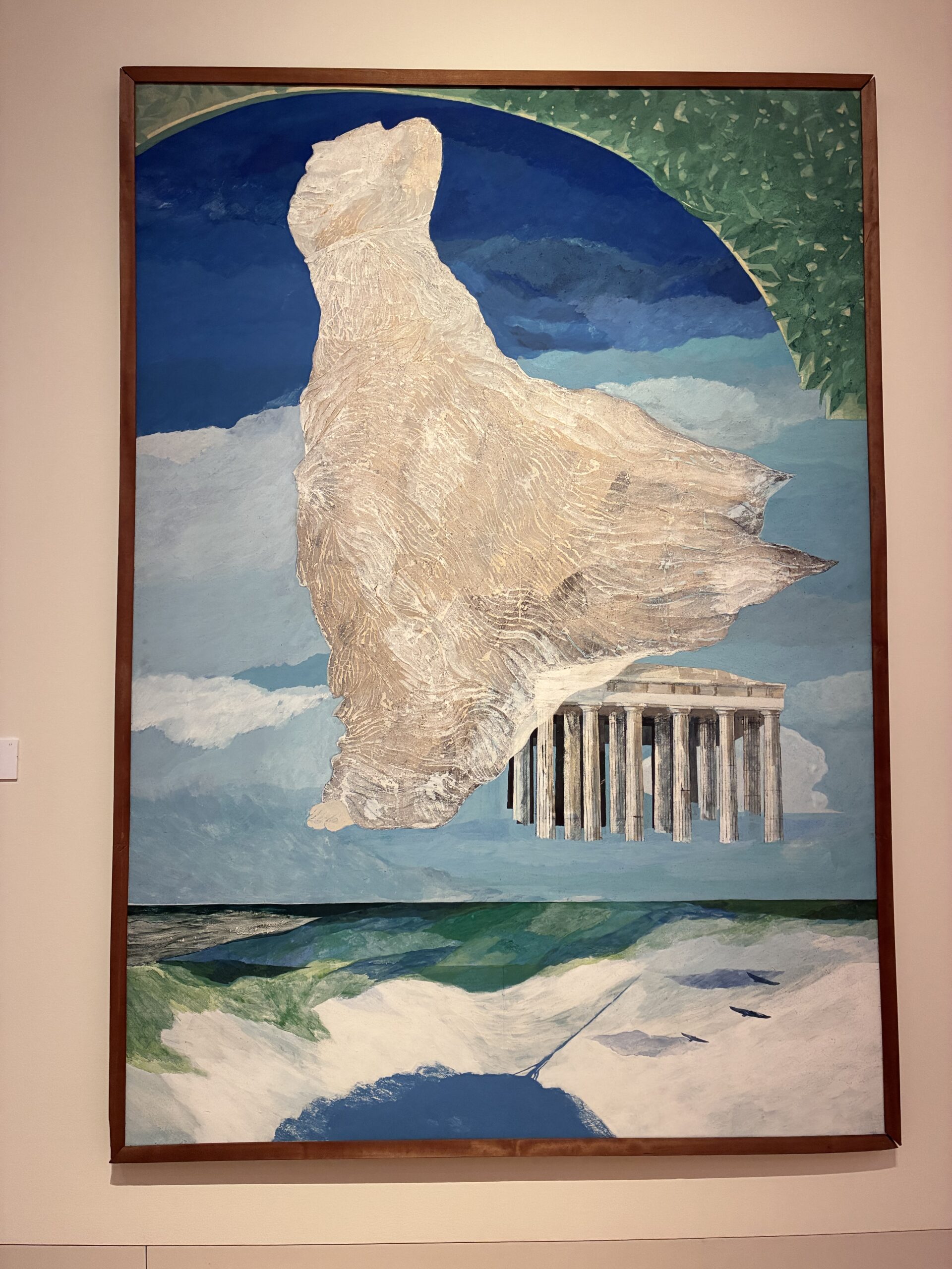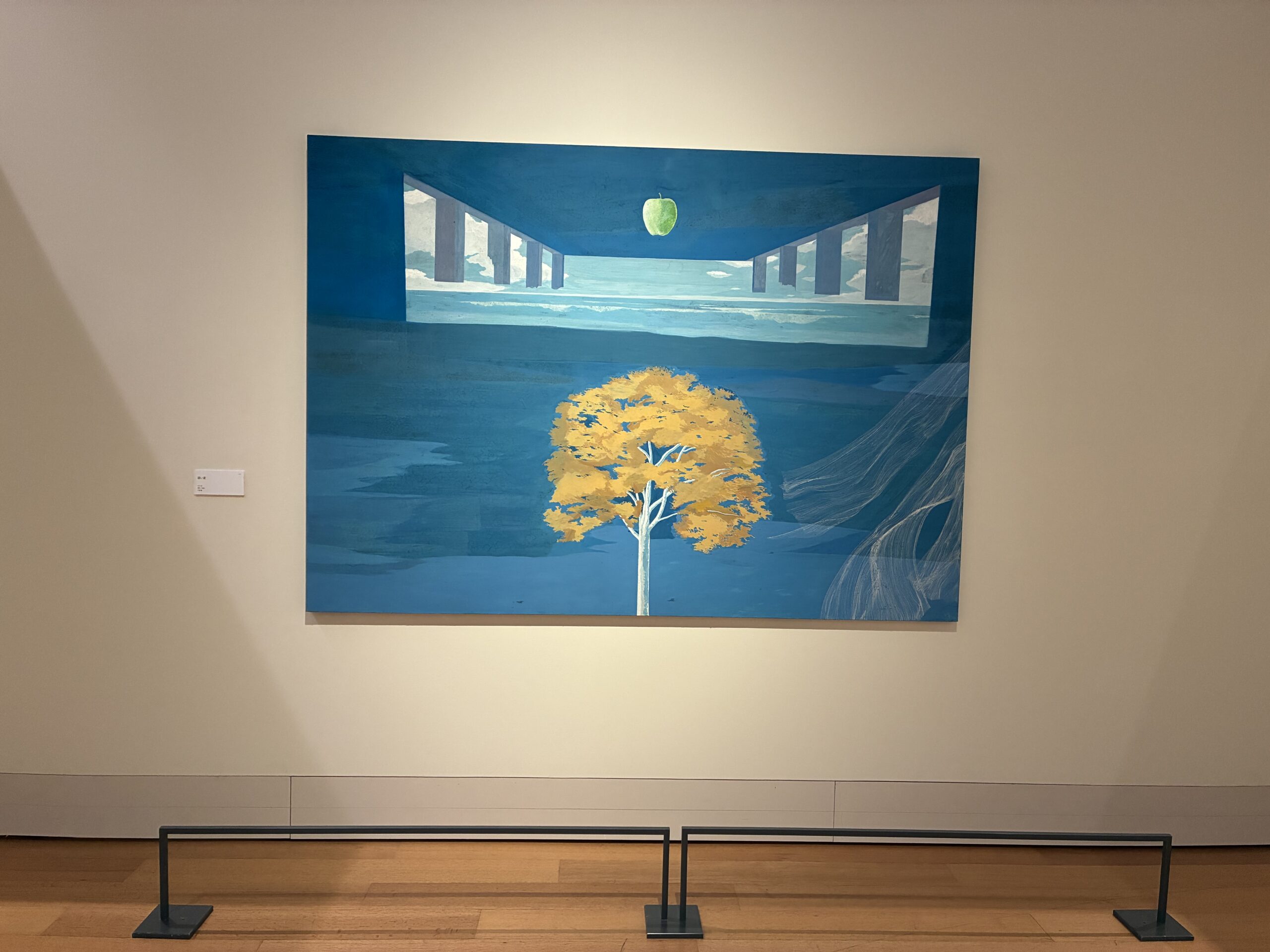 画風は大きく3期に変遷しているが、特に初期1970-1987「飛翔するイメージ」においては、シュルレアリスムの代表的な画家ルネ・マグリットの作品に画家自身が魅了されていたと言うとおり、マグリット同様の空に浮かぶ彫像や建物、リンゴなどのモチーフが超現実的な世界観を作り出しており、マグリット好きな私としては非常にそそられるものがある。また、このような画題を日本画として(日本画材で)描いていることも大変個性的で、魅力的だ。